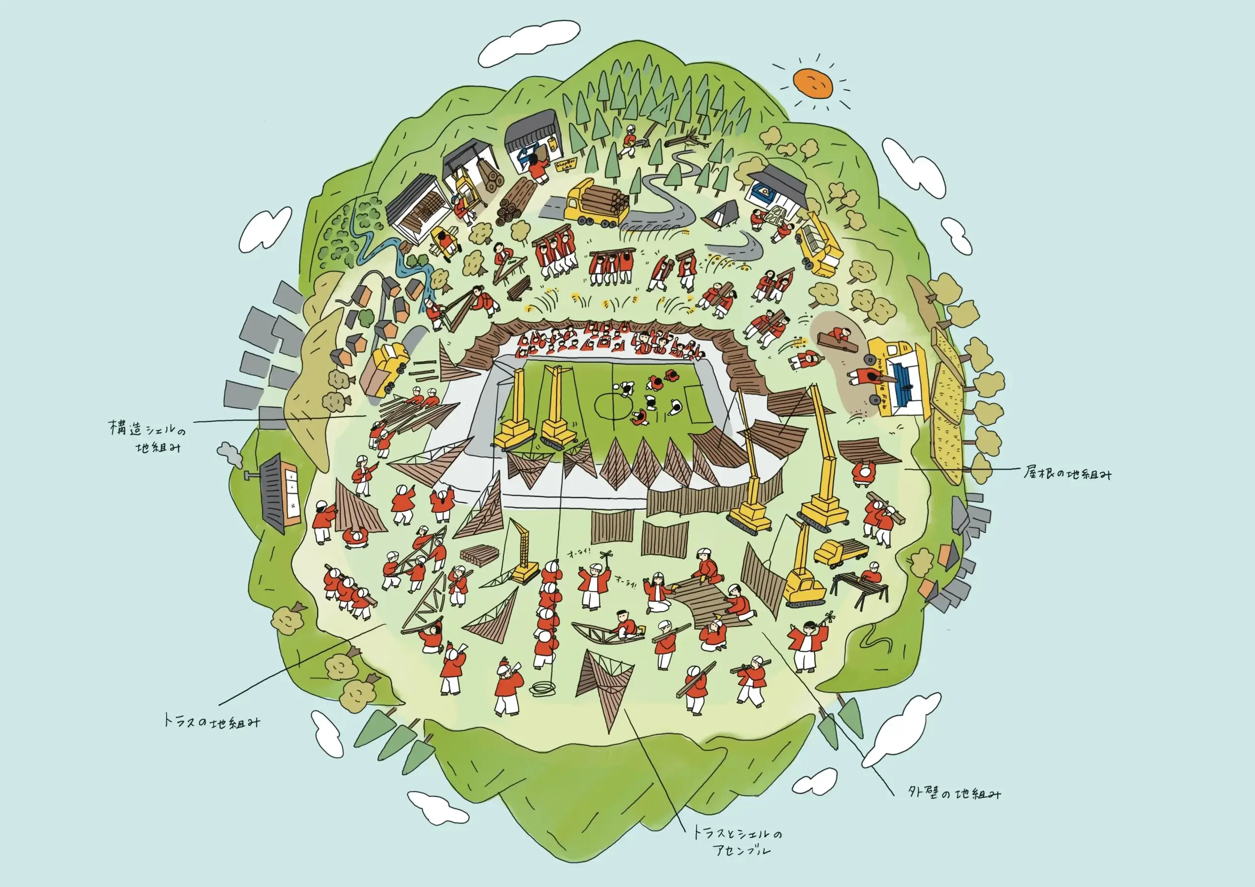 Koncept inspiraciju crpi iz šintoističkog rituala Shikinen Sengū, u kojem se hramovi periodično obnavljaju novim materijalima uz sudjelovanje lokalnih obrtnika. Dizajn stadiona temelji se na trima ciklusima, resursima, zajednici i vještini.