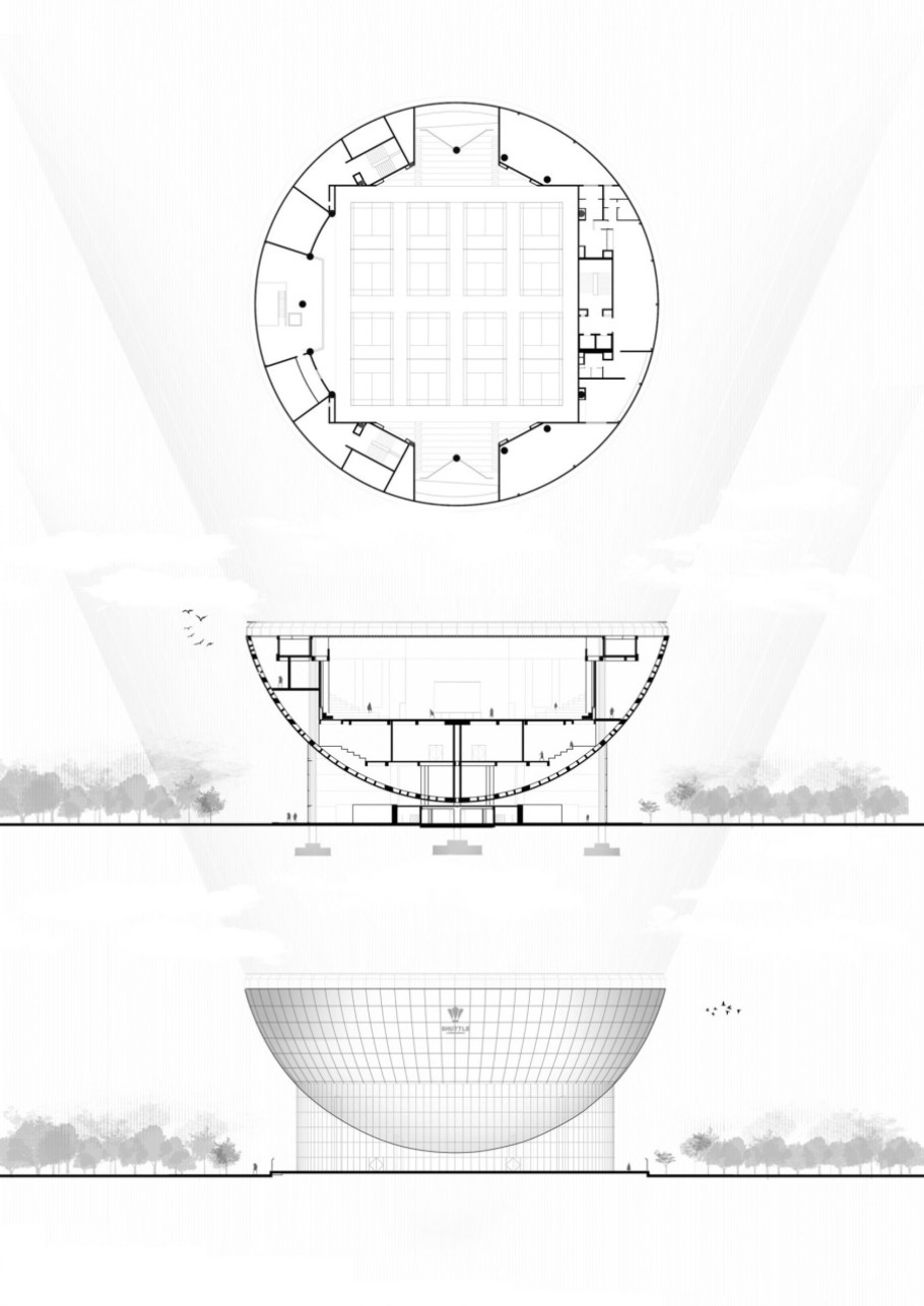 Archohm je dizajnirao badmintonski centar pod nazivom The Shuttle oko velike, otvorene dvorane koja sadrži osam badmintonskih terena s pogledom na stepenaste sjedalice.
