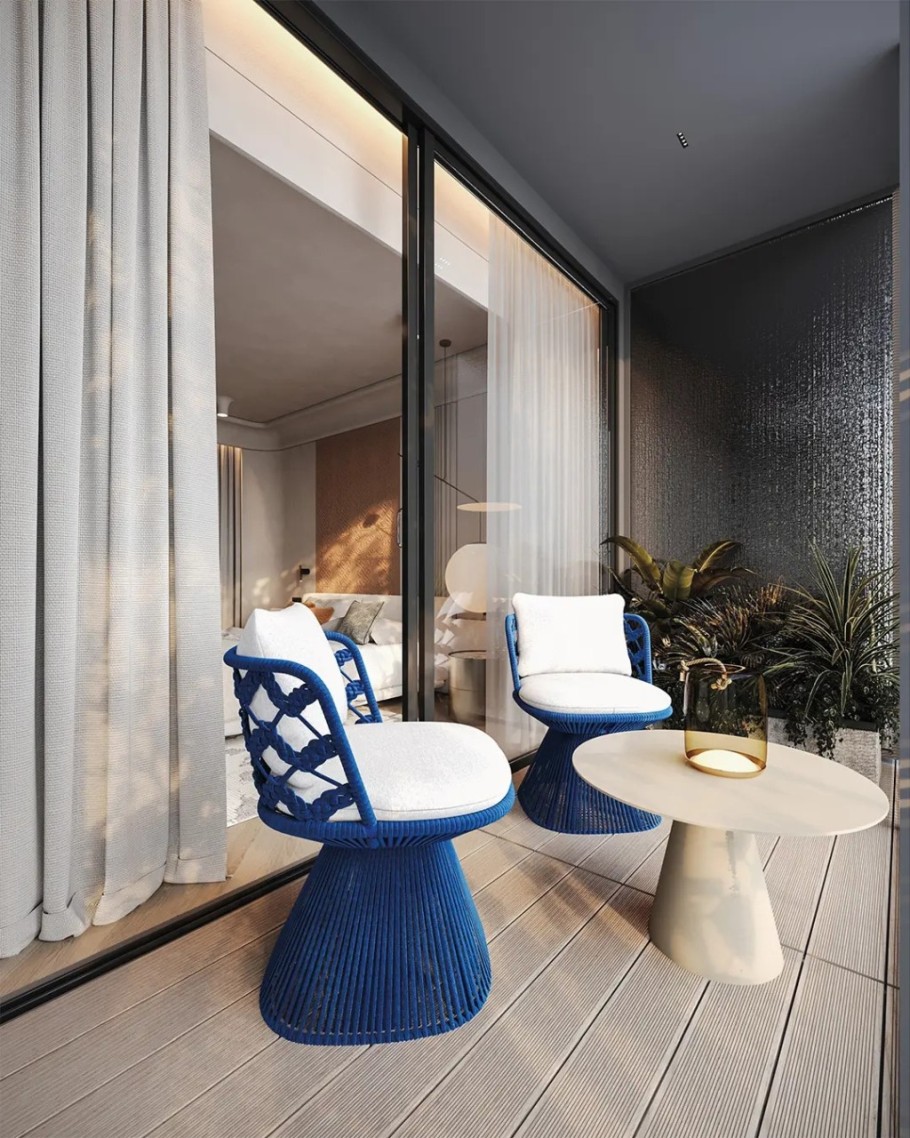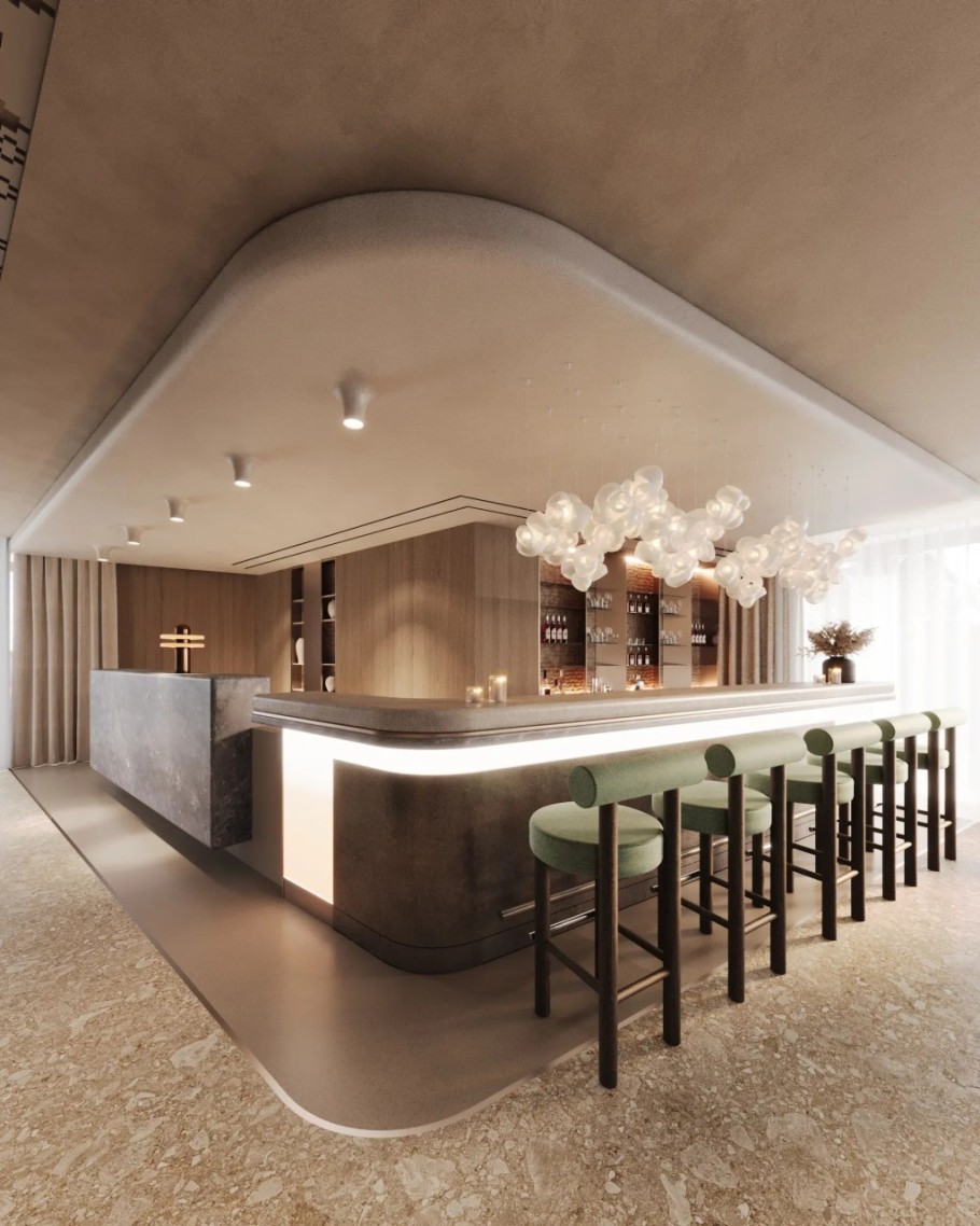 Prostor je zamišljen kao produžetak sunca i mora, s nježnim prijelazima između unutarnjeg komfora i vanjskog mira. Paleta plavih tonova, pješčanih nijansi i zlatnih akcenata priziva obalu, dok prirodni materijali, kamen, drvo i metal, naglašavaju autentičnost i taktilnu toplinu.