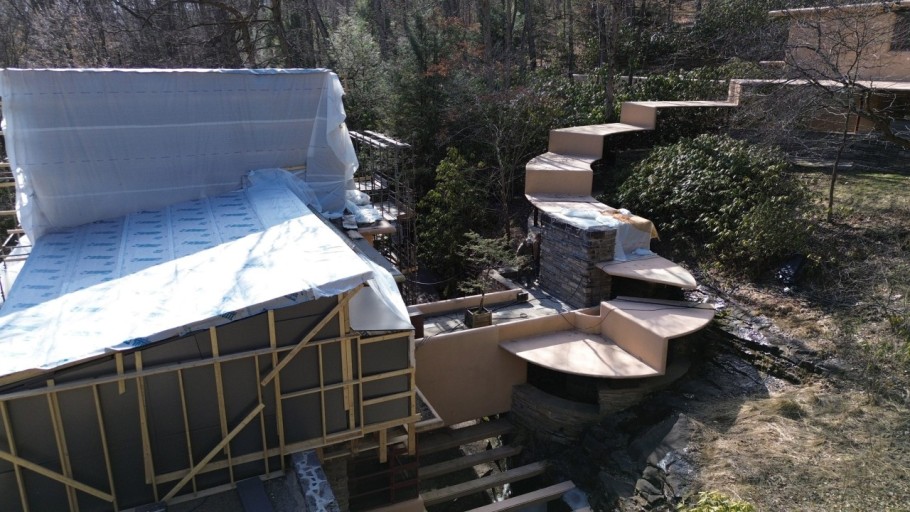 Fallingwater je od samog početka bio građevinski eksperiment. Konzolne terase od armiranog betona, koje lebde iznad vodopada, i danas predstavljaju jedan od najvećih konstruktivnih izazova. Tijekom desetljeća, upravo su te terase pokazivale znakove oštećenja, što je zahtijevalo dodatne intervencije i ojačanja.