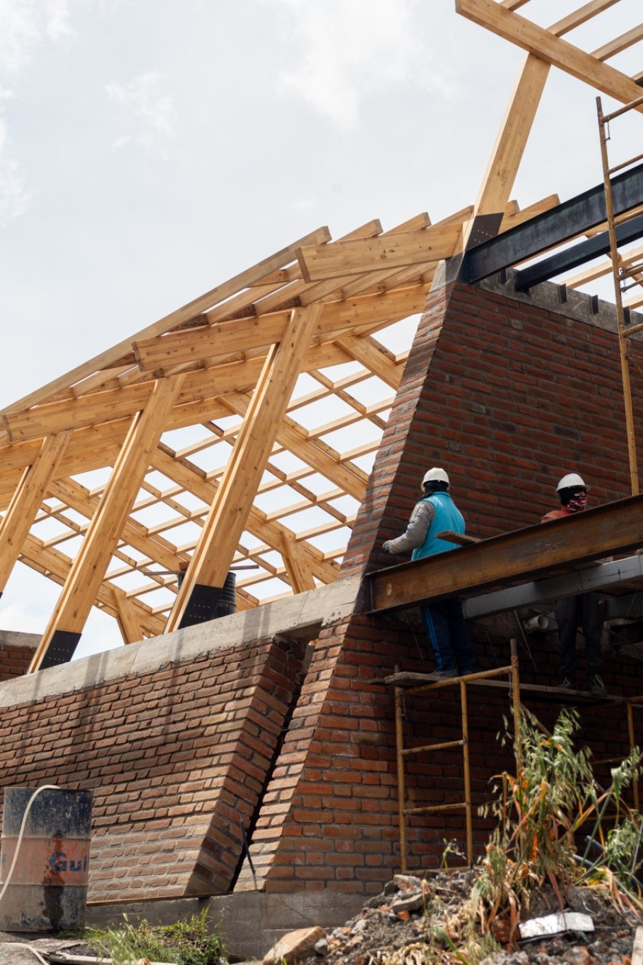 Materijali su odabrani u skladu s lokalnim uvjetima i dostupnošću, kombinirajući drvo, metal i opeku. Elementi od opeke prate teren i čine bazu objekta, dok se lakši materijali koriste u višim dijelovima konstrukcije. Ovakva hibridna struktura omogućuje prilagodbu zahtjevnim klimatskim uvjetima visokogorskog područja.