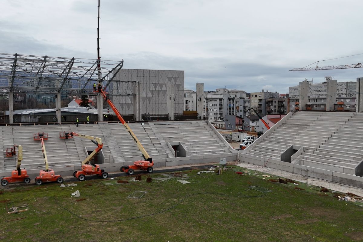 – Radovi na gradilištu napreduju prema planu. Na sjevernoj tribini završena je montaža armiranobetonskih predgotovljenih elemenata, a trenutačno se izvode radovi na čeličnoj krovnoj konstrukciji, nakon čega slijedi postavljanje krovnih slojeva. Na istočnoj tribini dovršeni su temelji te je u tijeku montaža prefabriciranih stupova, kosih greda i elemenata tribina. Južna tribina također ima završene temeljne radove, a uskoro započinje montaža konstrukcijskih elemenata. Najintenzivniji radovi odvijaju se na zapadnoj tribini, gdje je u tijeku izvedba monolitne konstrukcije, dio montažnih stupova i greda već je postavljen, dok će preostali elementi biti montirani tijekom veljače, a u ožujku slijedi montaža kosih greda i njihovo povezivanje s monolitnim dijelom konstrukcije, pojasnio nam je Sedlar.