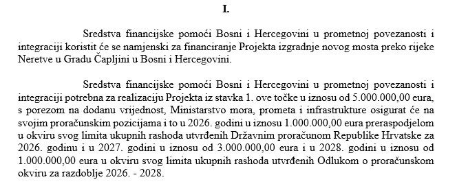 O tome da će Hrvatska susjednoj Bosni i Hercegovini sredstvima pomoći oko izgradnje novog mosta u Čapljini pričalo se već prošle godine. A na prijedlog Ministarstva mora, prometa i infrastrukture Vlada je sad donijela odluku o dodjeli financijske pomoći u tu svrhu u vrijednosti od 5 milijuna eura. Novac se dodjeljuje za prometnu povezanost i integraciju, a poslužit će u svrhu izvedbe projekta preko rijeke Neretve, odlučeno je 5. veljače 2026. na sjednici Vlade RH.