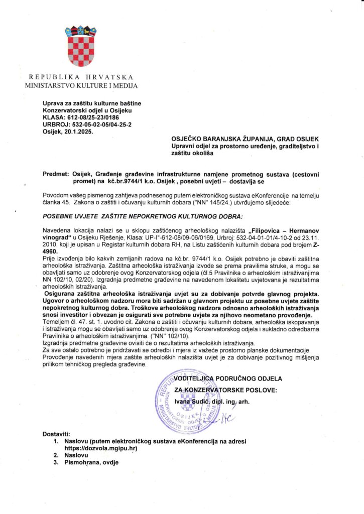Prisjetimo se, nova cesta u Osijeku gradi se za ukupno 789.511,75 milijuna eura, što je mrvicu više u odnosu na procijenjeni iznos njene izvedbe. Izvođač je odabran početkom lipnja 2025., a ugovor s tvrtkom Osijek-Koteks potpisan je 30. lipnja te u žalbenom roku nije bilo žalbi. Stoga projekt može mirno dalje, no ipak postoji još jedan korak koji se mora riješiti, a to su arheološki radovi.