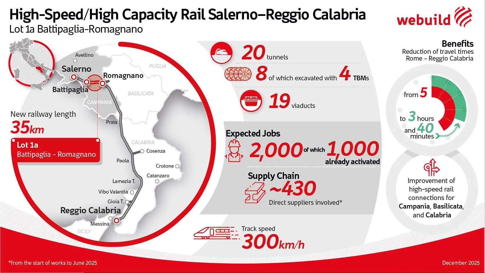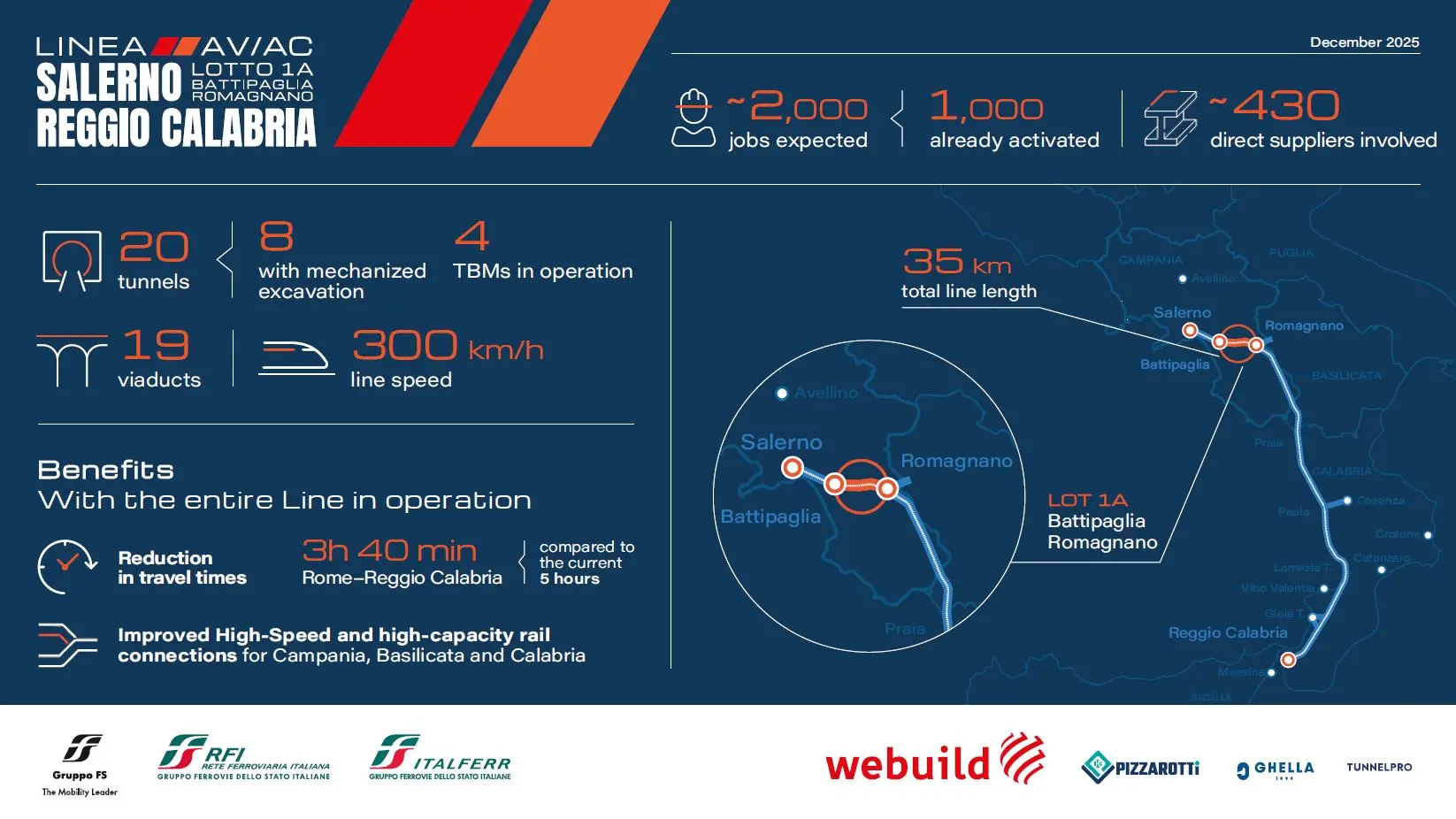Ostvaren je još jedan važan iskorak u razvoju prometne infrastrukture juga Italije. Na dionici Lot 1A Battipaglia – Romagnano započela su mehanizirana iskopavanja triju tunela u sklopu projekta brze i visokokapacitetne željezničke pruge Salerno – Reggio Calabria, koji za naručitelja RFI (Grupa FS Italiane) izvodi kompanija Webuild. Nova pruga bit će dio Skandinavsko-mediteranskog koridora transeuropske prometne mreže (TEN-T) te predstavlja jedan od strateški najvažnijih projekata za povezivanje juga Italije sa sjeverom zemlje i ostatkom Europe.