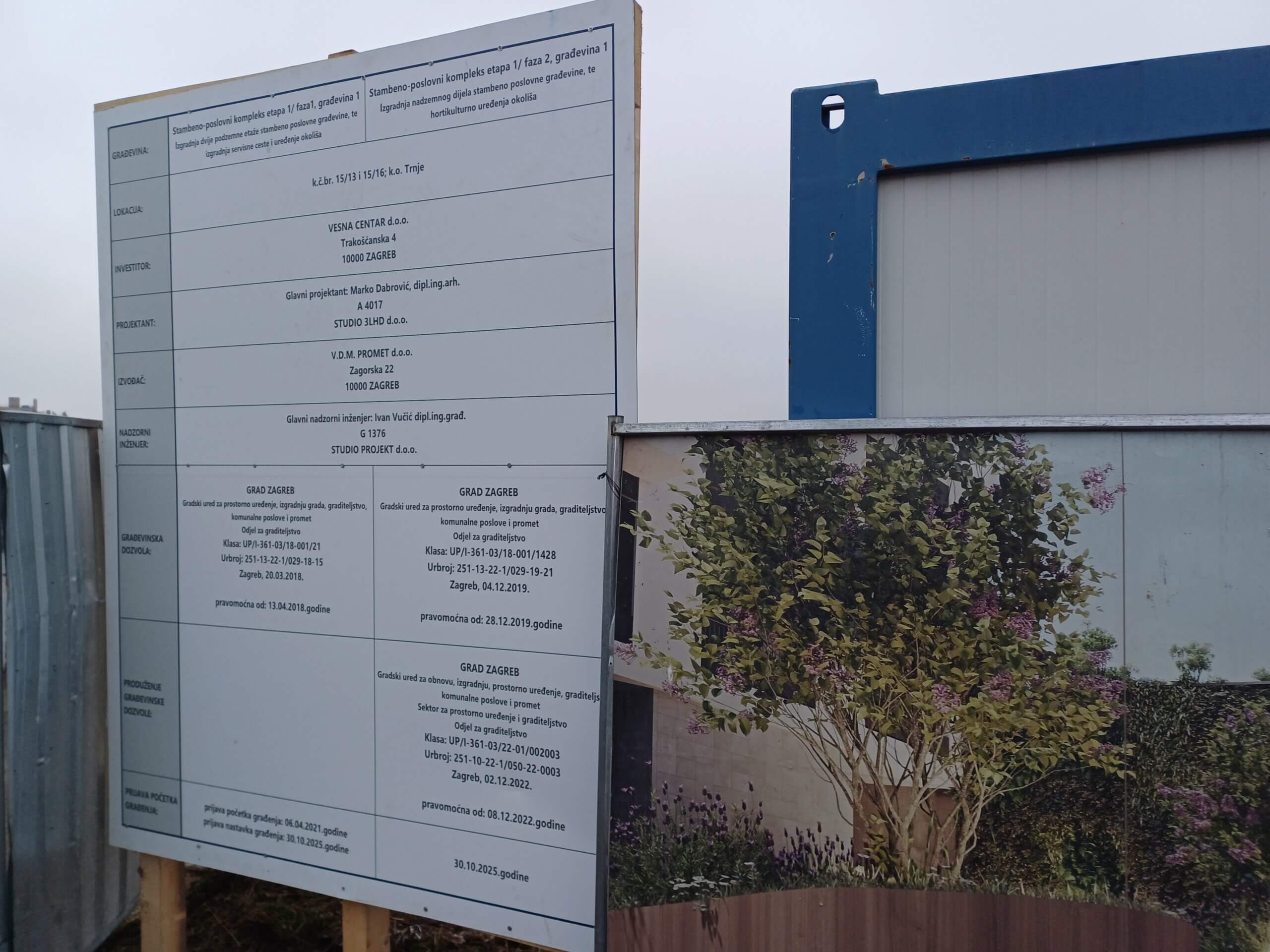 U stvari, početak građenja prijavljen je 6. travnja 2021. godine, a zatim je nastavak gradnje bio prijavljen dana 30. listopada ove godine, kako stoji na ulasku na gradilište. No, stanje na terenu odaje da se otad ništa nije izgradilo jer vidimo samo travu, i sad mjestimično razmaknutu zemlju uslijed početka ‘kopanja’.  Kreće gradnja druge faze prve etape stambeno poslovnog kompleksa, za investitora Vesna centar, tvrtke prijavljene u Trakošćanskoj 4 u Zagrebu.