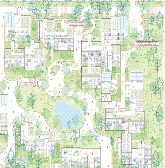 – Stambene jedinice organizirane su u male skupine uparenih zgrada koje se međusobno preklapaju kako bi svako stanovanje imalo optimalnu količinu sunčeve svjetlosti, povoljnu orijentaciju i prirodnu ventilaciju. Prizemlja sadrže ili stanove s privatnim, neograđenim vrtovima koji se neprimjetno stapaju s zajedničkim zelenilom, ili poslovne prostore s izravnim pristupom ulici — jedan po svakoj skupini. Ti su poslovni prostori strateški smješteni kako bi potaknuli društvenu interakciju i integraciju zajednice među stanovnicima, pojašnjeno je u opisu pobjedničkog projekta.