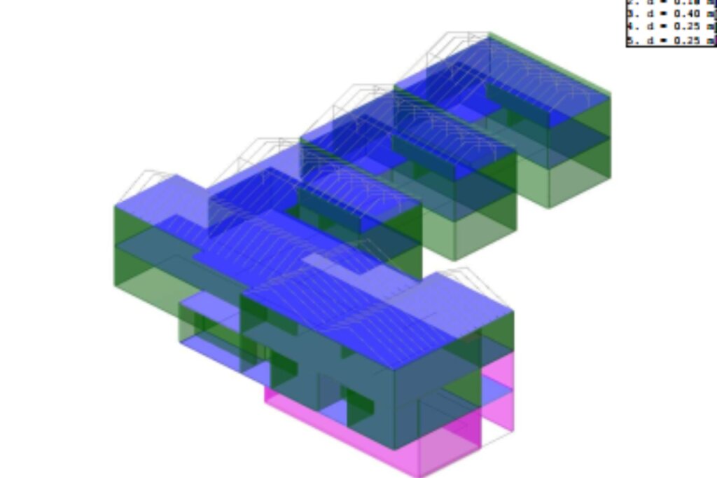 Nadalje, međukatne konstrukcije projektirane su kao pune armirano-betonske ploče debljine 18 cm, dok je podna ploča prizemlja debljine 15 cm, izvedena na sloju šljunka debljine 15 cm. Temeljenje je kombinirano: dijelom na trakastim AB temeljima visine 40 cm, a dijelom na temeljnoj ploči debljine 40 cm, sve prema statičkom proračunu i geotehničkom elaboratu. Beton temelja je klase C25/30 i C30/37, ovisno o poziciji.