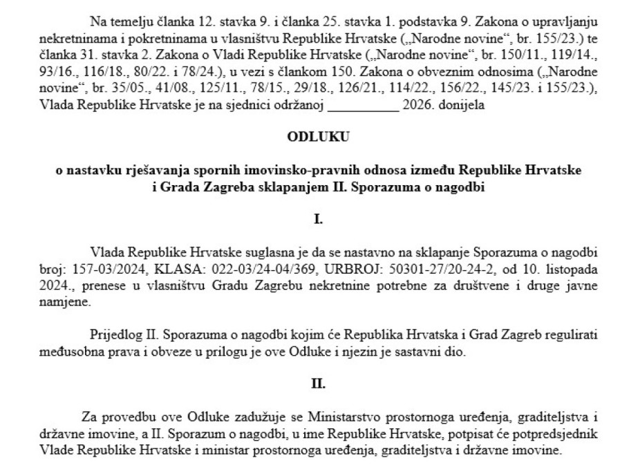 Na prijedlog Ministarstva prostornoga uređenja, graditeljstva i državne imovine, na sjednici Vlade dana 18. ožujka 2026. godine, donesena je Odluka o nastavku rješavanja spornih imovinsko-pravnih odnosa između Republike Hrvatske i Grada Zagreba. U tu svrhu, sklopljen je II. Sporazum o nagodbi, kako stoji u Odluci. I dalje je riječ o nekretninama koje Grad Zagreb dobiva nastavno na Sporazum sklopljen s državom oko zemljišta u Blatu, a novom Odlukom dobiva ih još šest.