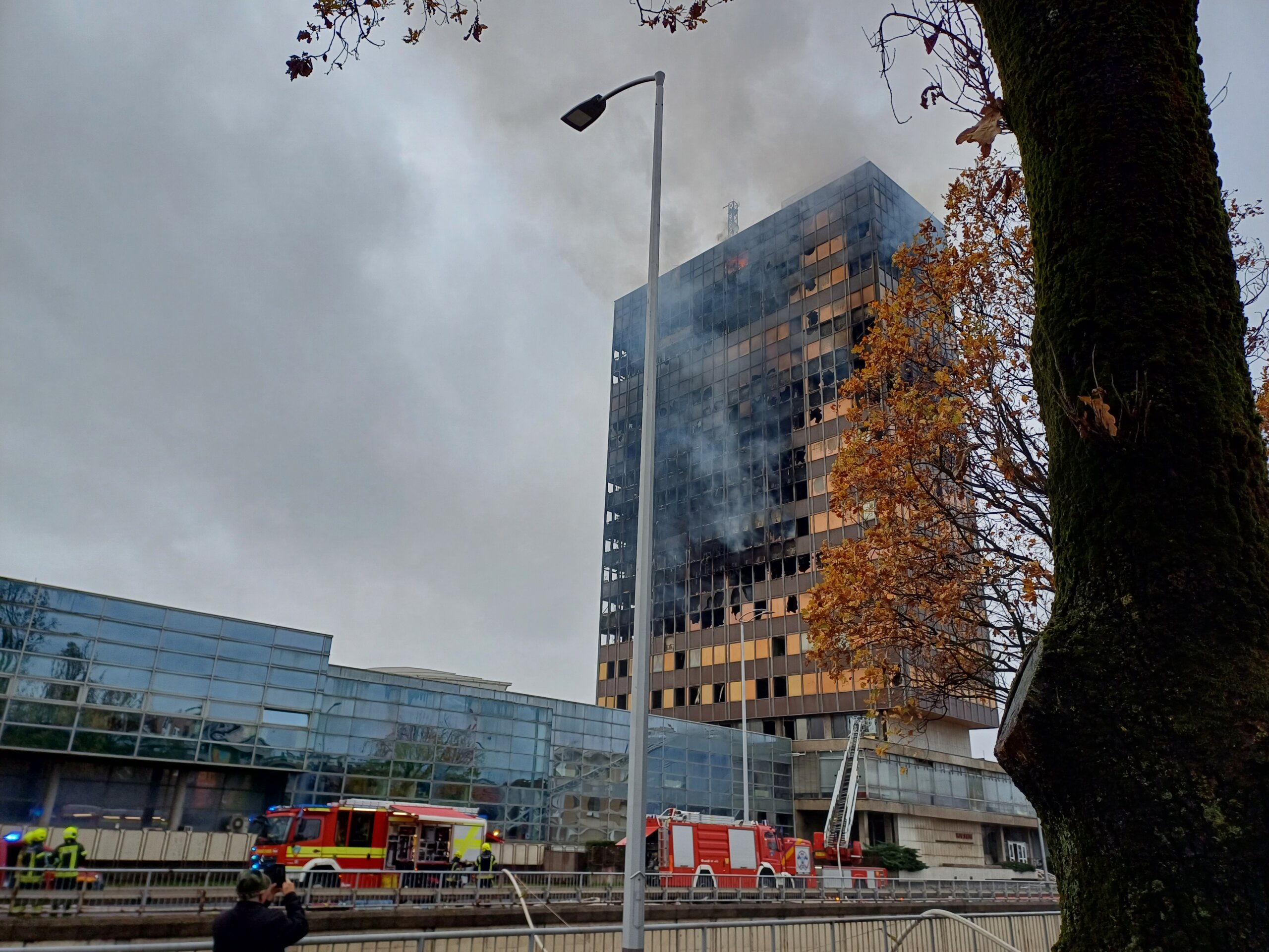 Vjesnikov neboder, svojevrsni simbol Zagreba, na jednoj od najatraktivnijih gradskih lokacija, gori od 23 sata 17. studenog, a po najnovijim informacijama na teren stiže statičar. Nakon što je krenulo gorjeti, na teren su došli vatrogasci iz cijelog grada, a jutros se i dalje opako dimilo, plamtjelo i odlamali su se zapaljeni komadi čelika i stakla s pročelja i iz unutrašnjosti. Čulo se pucanje materijala i naokolo su letjeli zagorjeli komadi papira. Sudbina građevine je neizvjesna, a govori se i o obnovi i o rušenju.