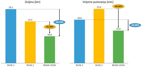 Tako je jer ne postoji ‘direktna’ cesta koja bi povezala dva grada, može se pročitati u Studiji utjecaja na okoliš koja se odnosi na zahvat nove prometnice koja bi trebala riješiti problem. Procjena kaže da bi se njenom izgradnjom vrijeme putovanja smanjilo za 40 posto, odnosno za 25 posto, ovisno o ruti, a vrijeme putovanja bilo bi duplo, ili barem za 35 posto kraće.