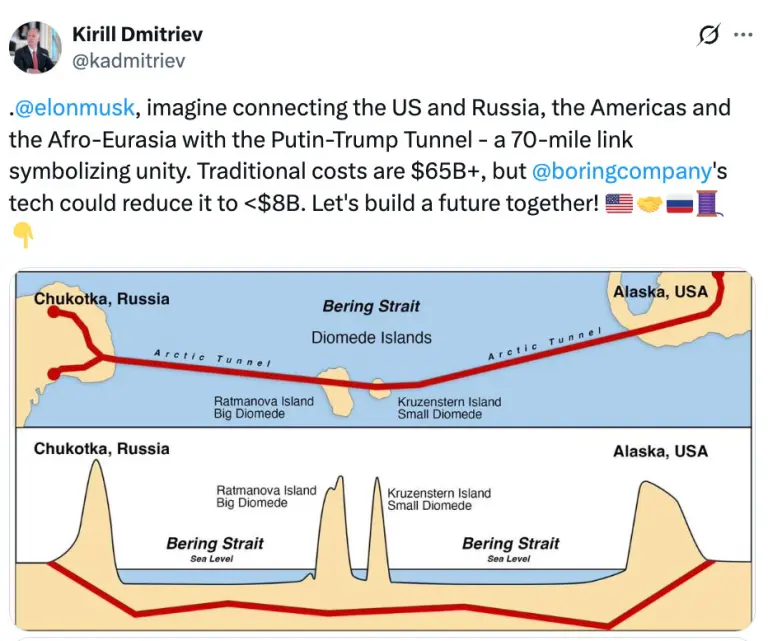 Sve je započelo kada je ruski investicijski izaslanik i blizak suradnik Kremlja Kiril Dmitriev na platformi X (bivšem Twitteru) objavio prijedlog da tvrtka Elona Muska, The Boring Company, izgradi podmorski željeznički tunel koji bi spojio dva kontinenta preko Beringovog tjesnaca. Prema Dmitrievu prijedlogu, projekt bi bio simbol jedinstva između Rusije i SAD-a, a tunel bi, kako je naveo, mogao nositi ime Tunel Putin-Trump.