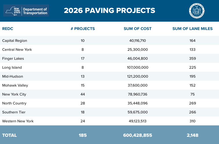 Guvernerka Kathy Hochul najavila je kako će tijekom građevinske sezone 2026. započeti rekordna investicija vrijedna 800 milijuna eura namijenjena obnovi i modernizaciji prometne infrastrukture. U sklopu projekta bit će asfaltirano više od 3.460 kilometara cesta u svakoj regiji države, čime će New York doslovno postati veliko gradilište.