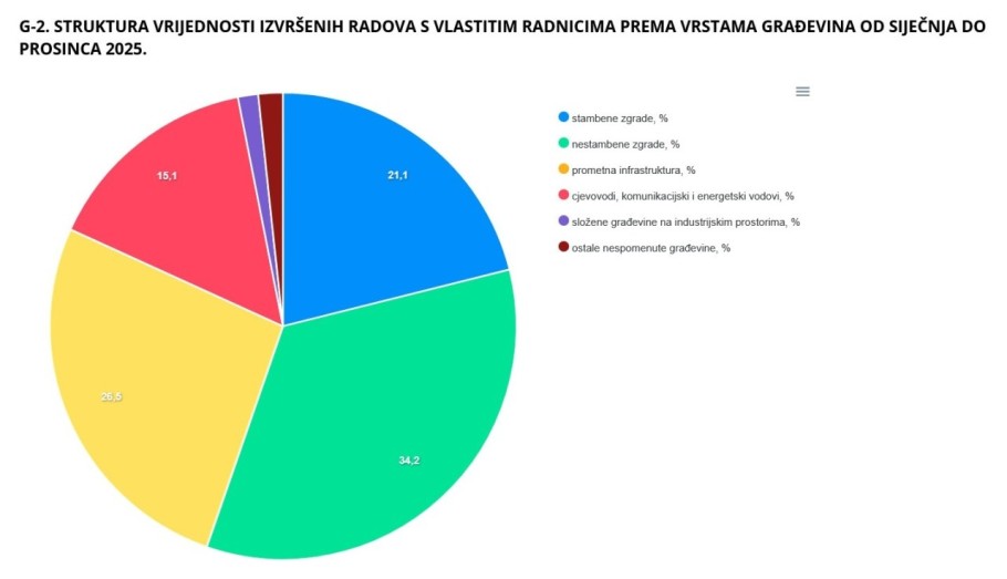 Na razini cijele 2025. godine vrijednost novih narudžbi dosegnula je 6,67 milijardi eura, pri čemu se 3,82 milijarde eura odnosilo na zgrade, a 2,86 milijardi na ostale građevine. Vrijednost izvršenih radova iznosila je 7,49 milijardi eura, od čega su poslovni subjekti s vlastitim radnicima realizirali 5,23 milijarde eura.