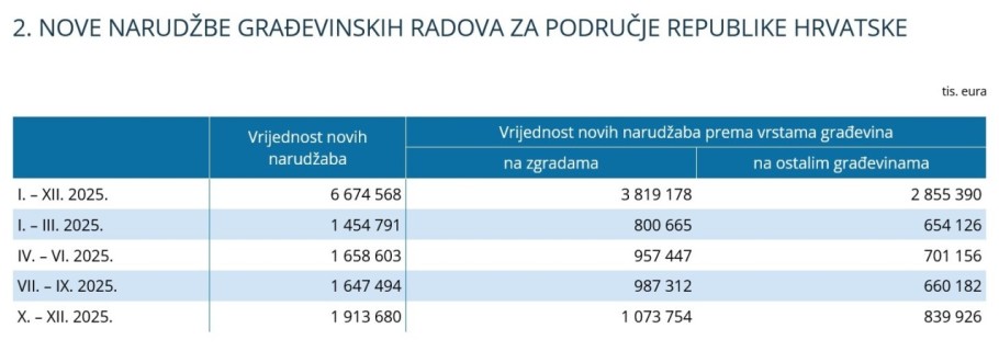 U razdoblju od listopada do prosinca 2025. ugovoreni su novi poslovi u vrijednosti od 1,91 milijardu eura, što je najviši kvartalni iznos u godini. Od toga se 1,07 milijardi eura odnosilo na zgrade, a 839,9 milijuna eura na ostale građevine poput prometne i komunalne infrastrukture.
