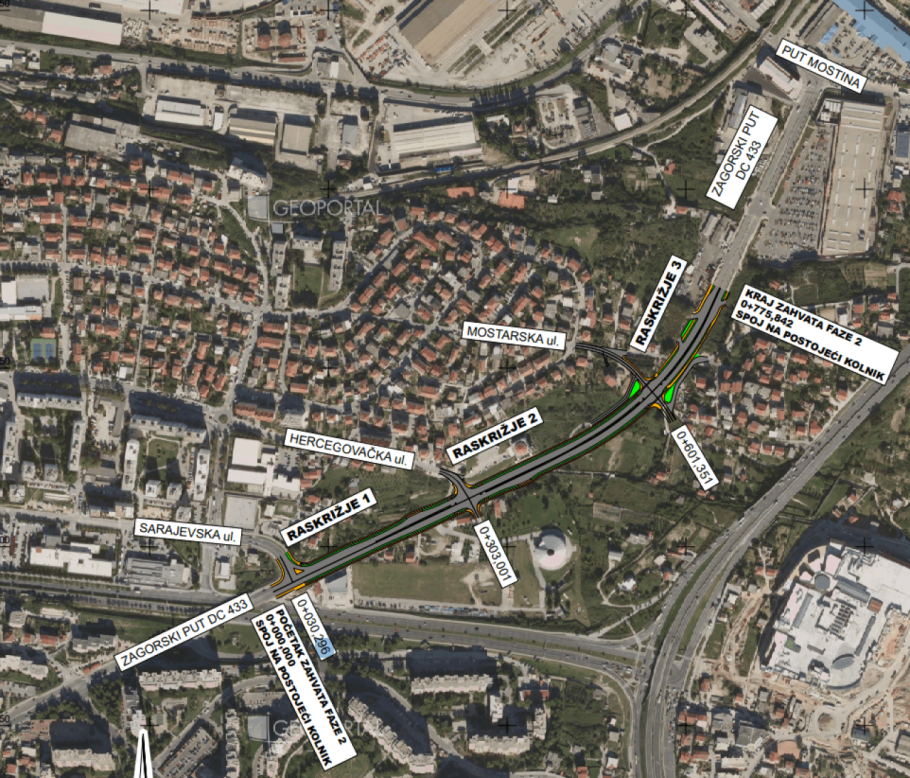 Kod raskrižja s Hercegovačkom i Mostarskom ulicom predviđene su dodatne trake za lijevo skretanje iste širine, a prometni smjerovi bit će razdvojeni razdjelnim otokom širine 1,5 metara, koji se proteže do spoja s postojećim kolnikom prve faze projekta. U okviru projekta planirana su i dva autobusna stajališta u zoni raskrižja s Hercegovačkom ulicom, po jedno u svakom smjeru, kao i pješačko-biciklistički prijelazi na svim raskrižjima.