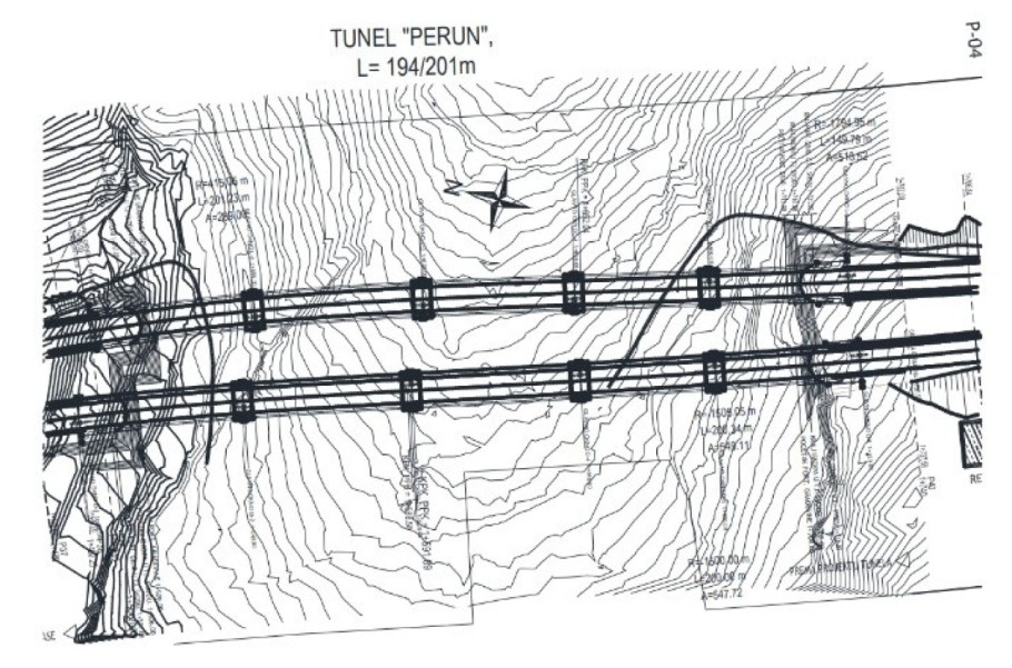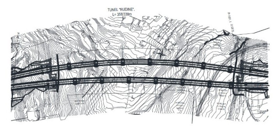 Oko 1,2 kilometra od početka trase ona se razdvaja na dva odvojena tunela gdje se promet vodi kroz lijevu i desnu tunelsku cijev, poznate kao Perun i Rudine. Nakon otprilike tri kilometra, tunelske trase ponovno se spajaju u jedinstvenu cestu koja se dalje nastavlja voditi glavnom osi.