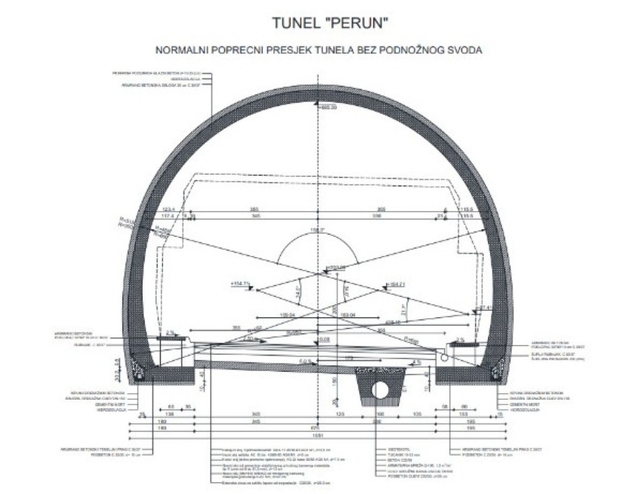 Dvocijevni cestovni tunel Perun omogućuje siguran i protočan promet u oba smjera, pri čemu se lijeva i desna tunelska cijev vode paralelno kroz brdovito i geološki zahtjevno područje. Lijeva cijev duga je oko 194 metra, a desna oko 201 metar, uključujući portalne građevine koje oblikuju ulaze i izlaze iz tunela. Trasa tunela prolazi kroz flišne naslage i područja s lokalnim pojavama čvršćih stijena, što je zahtijevalo prilagodbu projekta stvarnim uvjetima na terenu.