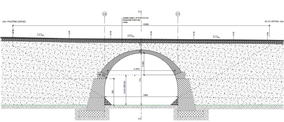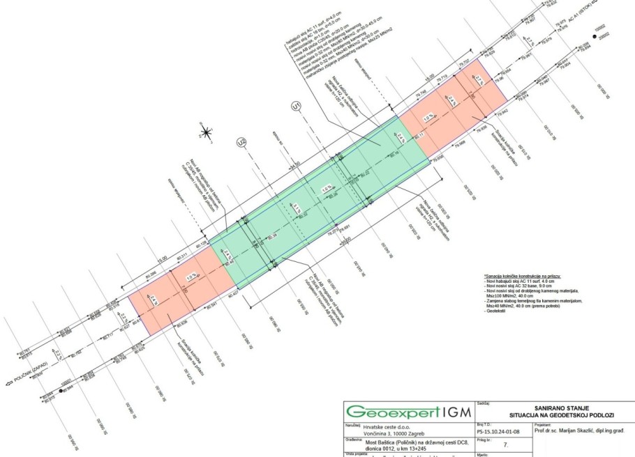 Po uklanjanju kolničke konstrukcije u unaprijed predviđenoj debljini trebat će sanirati unutarnje površine betonskih čeonih zidova i krila u zoni ugradnje novog kolnika. Izvest će se novu kolničku konstrukciju od nosivog sloja, drobljenog kamenog materijala, AB ploče i asfaltnih slojeva.