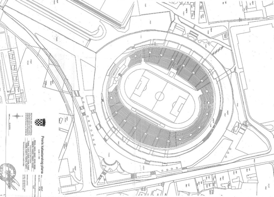 Zona oko stadiona, površine 60.000 četvornih metara, namijenjena je pješacima, a sastoji se od asfaltiranih i zelenih površina. Osim po arhitektonskoj koncepciji, stadion se izdvaja i jedinstvenom krovnom konstrukcijom težine 680 tona, površine 18.000 četvornih metara i dimenzija 205 × 47 metara, čiji su projektanti, prema autorskoj zamisli Borisa Magaša, u natječajnom radu Marijan Blažina, a u izvedbenom radu i izradi tehničke dokumentacije Boženko Jelić i Ante Mihanović.