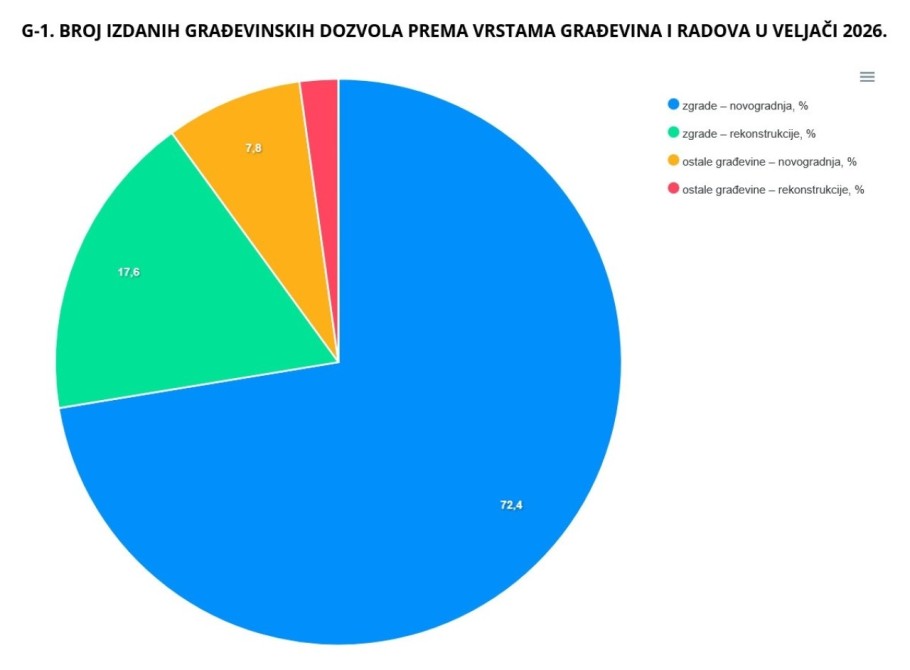 Prema vrstama građevina, čak 90 posto izdanih dozvola u veljači odnosi se na zgrade, dok preostalih 10 posto otpada na 'ostale građevine'. Ovakav omjer potvrđuje kontinuiranu orijentaciju investitora prema izgradnji objekata za stanovanje i poslovne svrhe.