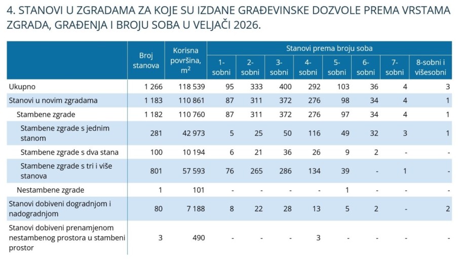 Na temelju izdanih dozvola u veljači predviđena je izgradnja 1.266 stanova, s prosječnom površinom od 93,6 četvornih metara. Većina tih stanova planirana je u novim zgradama, što dodatno potvrđuje dominaciju novogradnje.