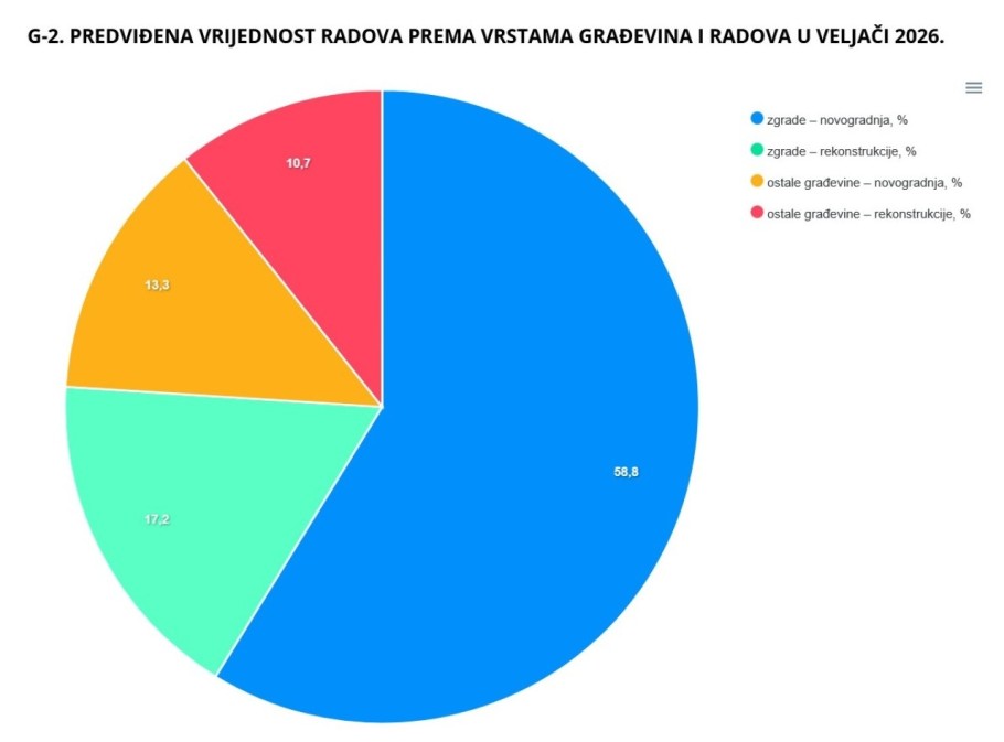 Ukupna predviđena vrijednost radova u veljači iznosi 481,2 milijuna eura, pri čemu se najveći dio odnosi na zgrade. Od toga je za novogradnju predviđeno 347,2 milijuna eura, dok rekonstrukcije čine 134,1 milijun eura.