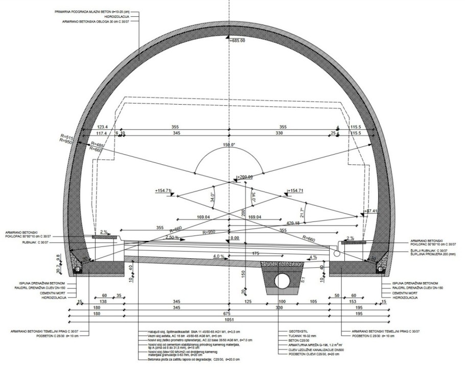 Zbog složene geološke građe, tunel se izvodi uz različite sustave podgrade koji se primjenjuju ovisno o kvaliteti stijenske mase, od lakših do izrazito ojačanih konstrukcijskih rješenja. Iskop se provodi kontroliranim miniranjem u etapama, uz stalno osiguranje svoda i bokova mlaznim betonom, čeličnim mrežama i sidrima.