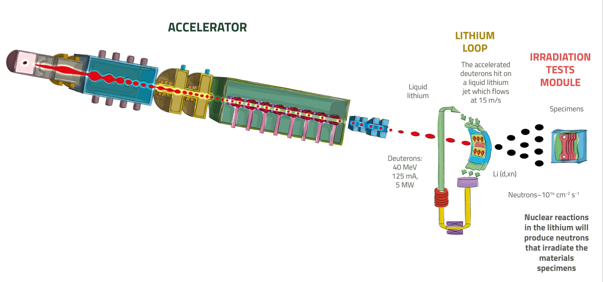 IFMIF će imati pet glavnih dijelova – akceleratore čestica, ciljni uređaj s litijem, testni modul, centar za pregled materijala nakon zračenja (PIE) i sve potrebne pomoćne objekte, sve prema međunarodnim sigurnosnim standardima za nuklearne objekte. Akceleratori će slati vrlo snažan snop čestica, dovoljno jak da stvori neutron flux usporediv s uvjetima na ‘prvom zidu’ fuzijskog reaktora, to je površina koja je direktno izložena energiji fuzijske reakcije. U testnom modulu bit će moguće ispitati do tisuću malih uzoraka materijala, analizirati njihovu čvrstoću, otpornost i izdržljivost te stvoriti važnu bazu podataka koja će pomoći inženjerima da budu sigurni u materijale koje će koristiti za gradnju budućih fuzijskih reaktora.