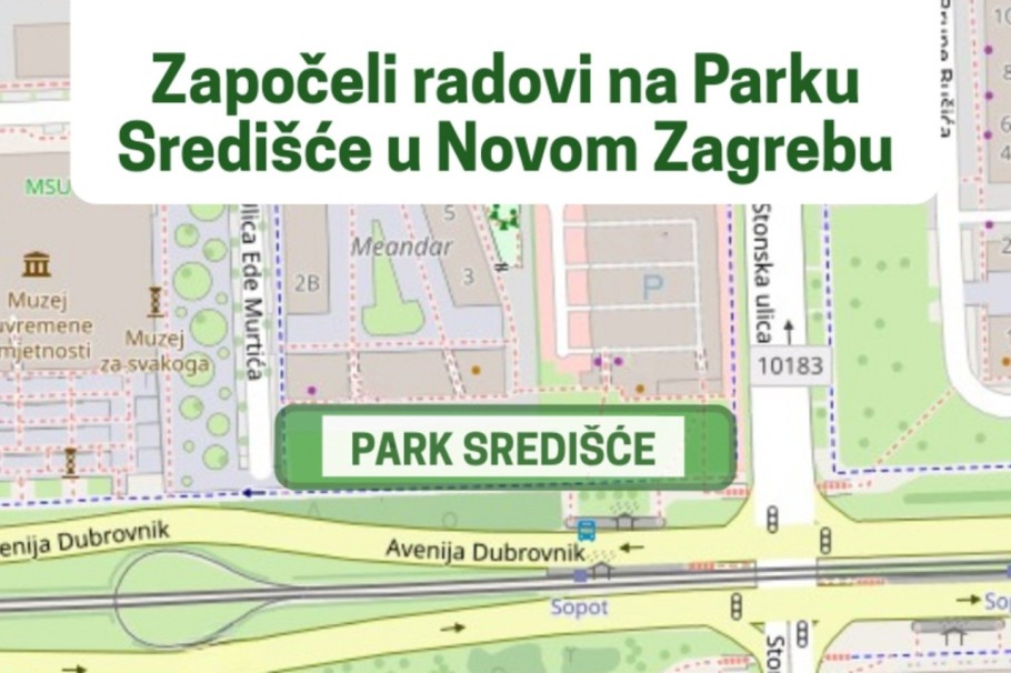 U Novom Zagrebu započeli su radovi na uređenju Parka Središće, novog javnog prostora koji će povezati okoliš Muzeja suvremene umjetnosti s istočnim dijelom Središća. Pratit će zeleni pojas uz Aveniju Dubrovnik, između Ulice Ede Murtića na zapadu i Stonske ulice na istoku.